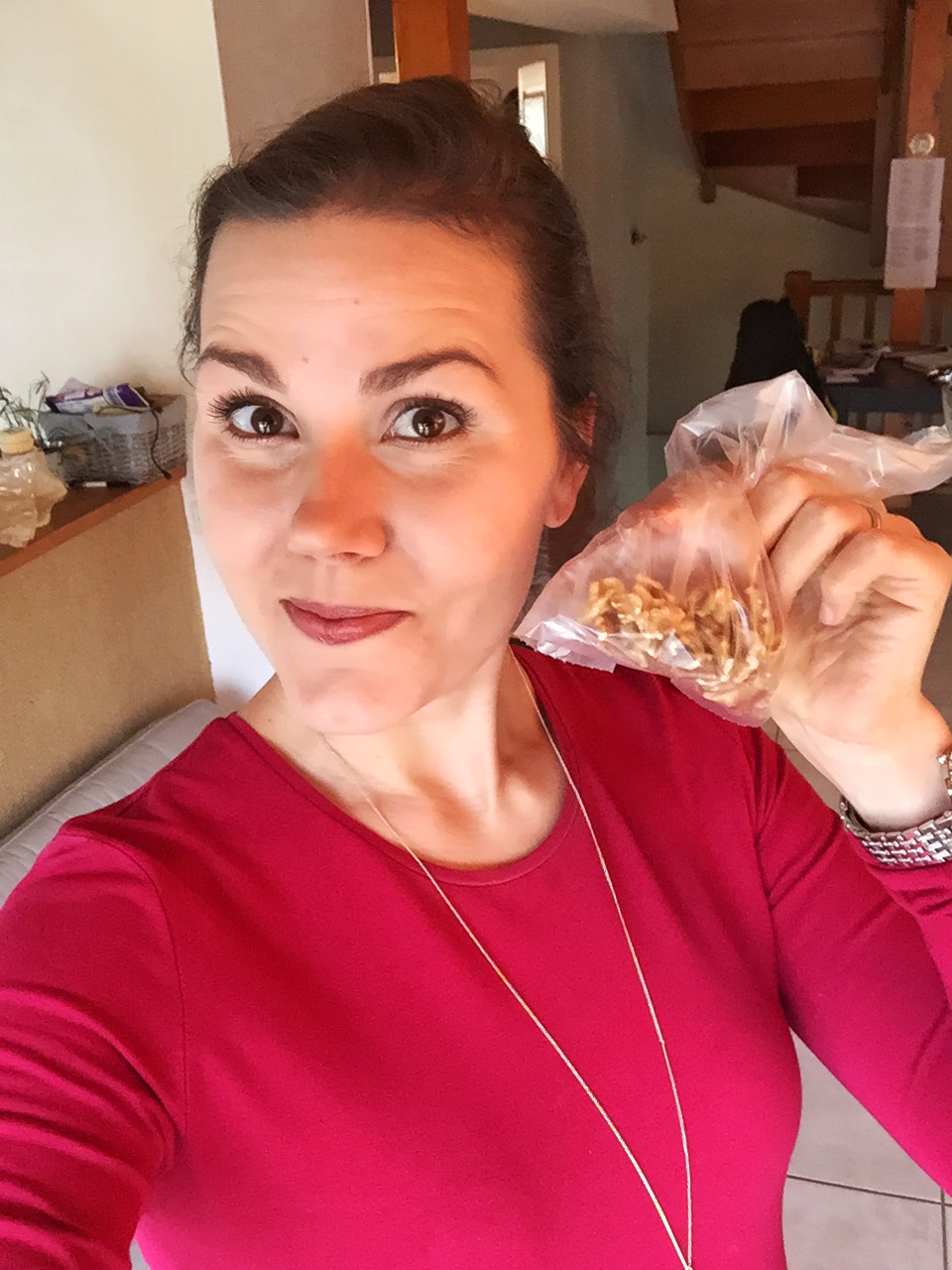 This is one serving of nuts–roughly 200 calories worth! It’s TINY right?? Yes, nuts are good for you, but it’s VERY easy to overeat healthy foods–so watch those portions!!