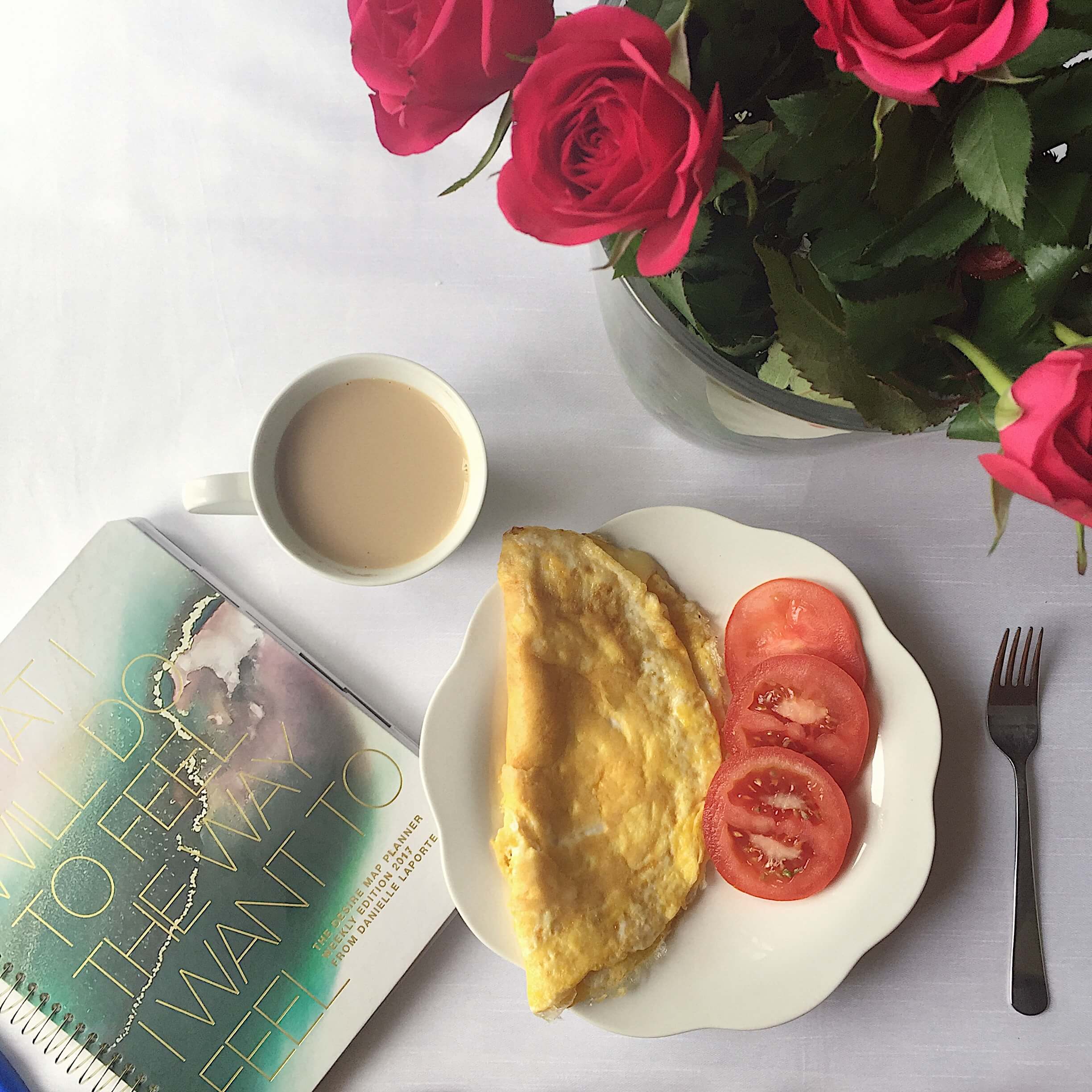 Omelet that I cooked in REAL butter with gruyère cheese. Don’t fear fat—it keeps you full =)
